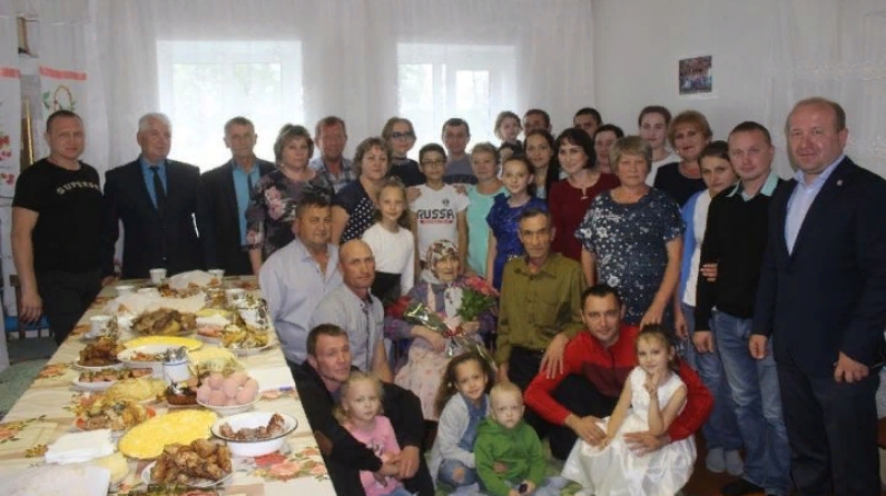 Надежда Артемьевна имеет медаль Материнства, она вырастила 9-х детей (родила 14!). У счастливой бабушки 16 внуков и 29(!) правнуков. Гости вручили ей поздравление Президента РФ и подарок, пожелали всего самого хорошего.