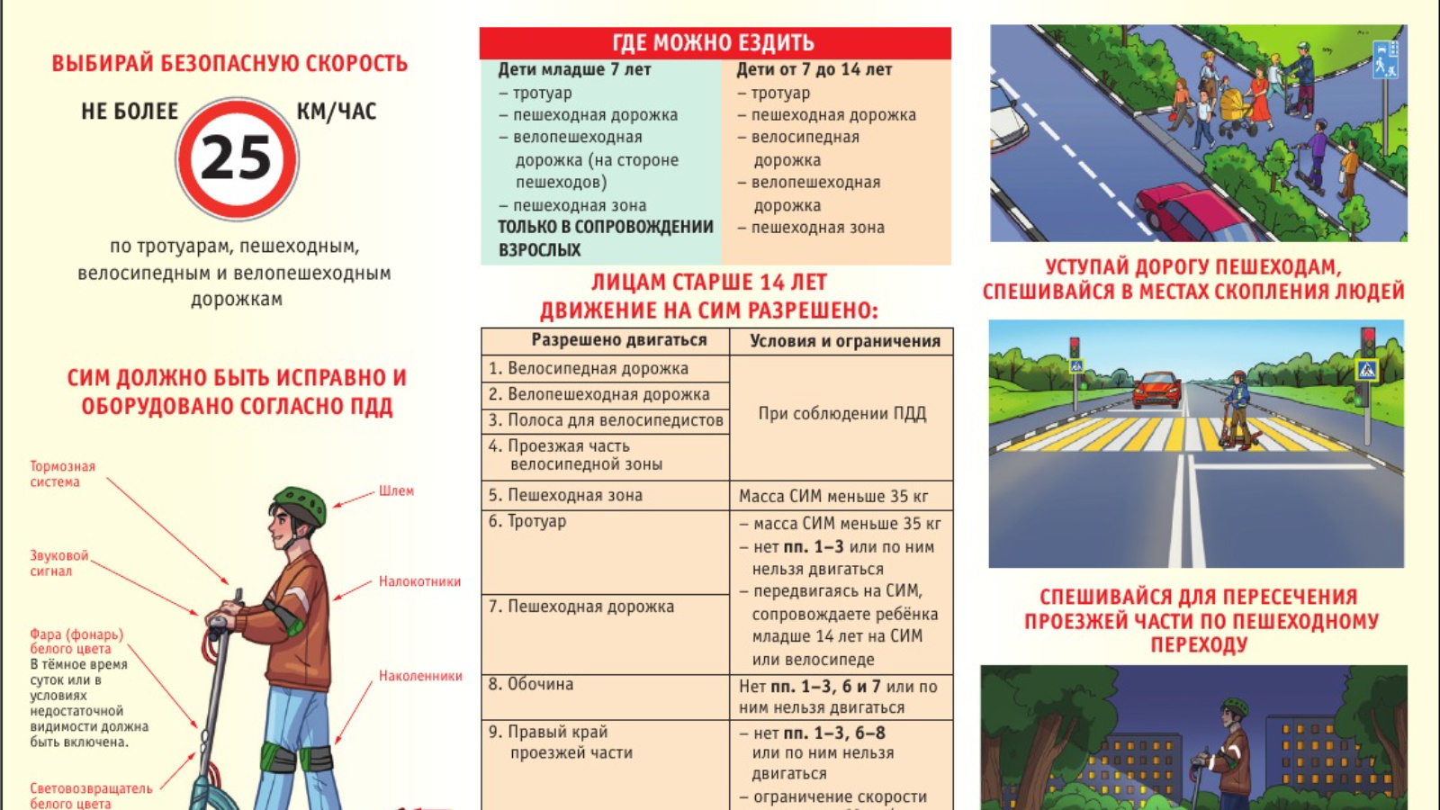 Скоростной режим: В пешеходных зонах - не более 15 км/ч, на велодорожках - до 25 км/ч, на проезжей части - согласно общим ограничениям