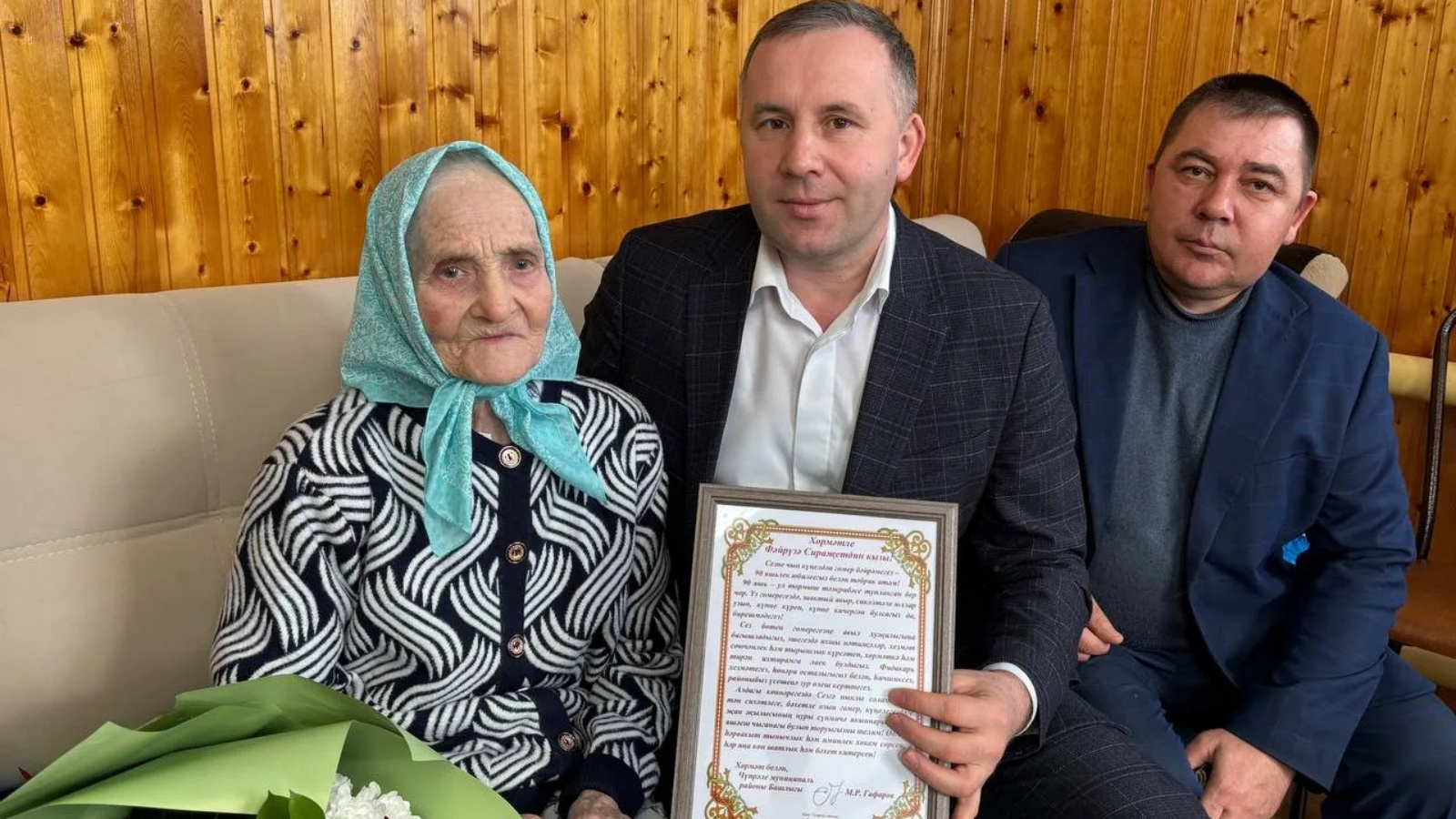 90-летним юбилеем Фейрузю Сиразетдиновну Ибрагимову жителя с.Мочалей поздравили Заместитель руководителя исполкома Ильмир Измайлов и глава Матакского поселения Владимир Шумилов вручили имениннице поздравление главы Дрожжановского муниципального района М.Р.Гафарова.